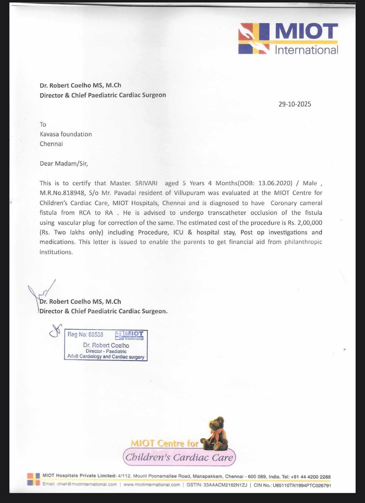 Srivari, a 5-year and 4-month-old boy (DOB: 13.06.2020), has been diagnosed with a Coronary Cameral Fistula — an abnormal connection between the coronary artery (RCA) and the right atrium (RA). This rare heart condition needs urgent correction to prevent serious complications.