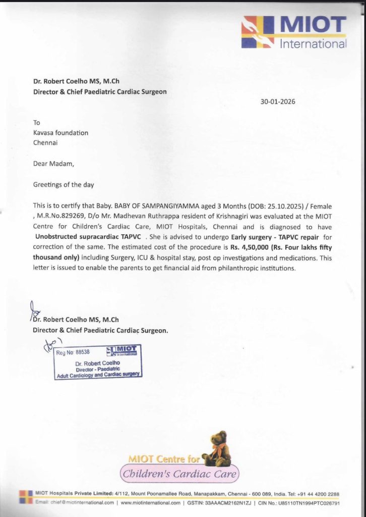 Baby of SampangiYamma, a 3-month-old female infant (DOB: 25.10.2025), residing in Krishnagiri, has been diagnosed with Unobstructed Supracardiac Total Anomalous Pulmonary Venous Connection (TAPVC) — a critical heart defect that requires early surgical correction for survival.